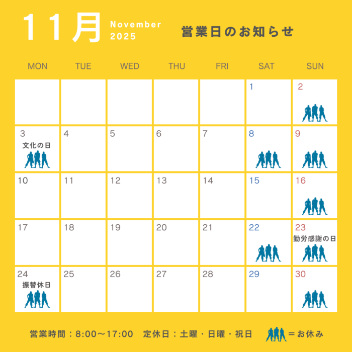 お知らせ 営業日(2025年11月)を更新しました 2025.10.27 ホームページをご覧いただきありがとうございます。11月の営業日は下記の通りです。 お問合せはこちら お問い合わせ 営業日(2025年10月)を更新しました 前の記事