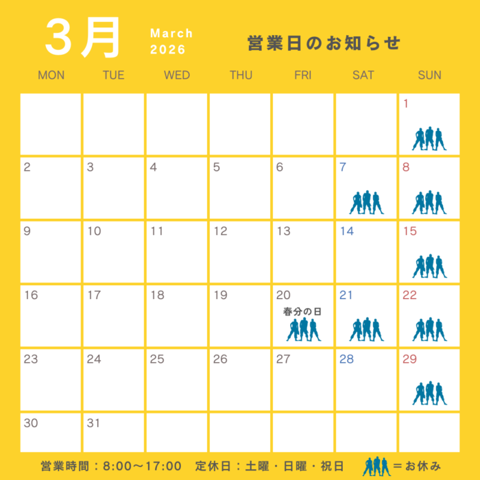 お知らせ 2026年3月営業日カレンダー 2026.02.25 ホームページをご覧いただきありがとうございます。3月の営業日は下記の通りです。 お問合せはこちら お問い合わせ 雨漏り調査レポート・関連コラムのご案内 前の記事