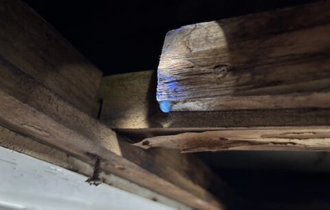 (原因②)外壁(ALCパネル)目地の亀裂より雨水が浸入していました。シーリングによる目地補修が必要です。